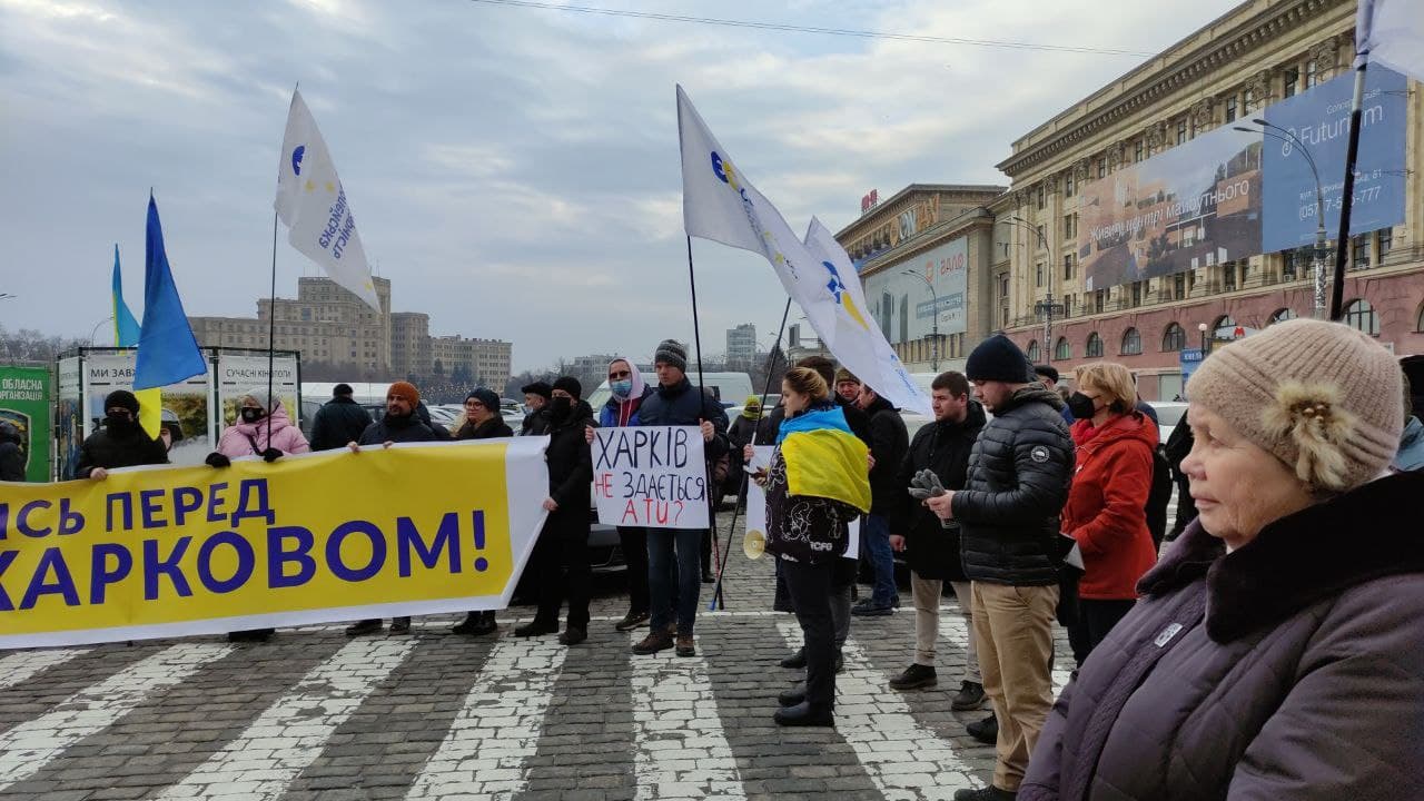 Перед приездом президента Украины Владимира Зеленского на заседании СНБО в Харьков на площади Свободы состоялся пикет, организованный ГО «Справа громад».